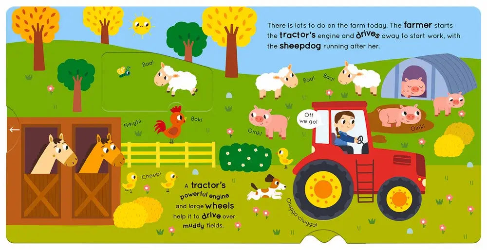 BOARD BOOK. Push, Pull, Slide Board Book Explore and learn all about the farm with this interactive book that's full of tractors and animals to push, pull, and slide! There is a chunky card mechanism on each page to push, pull, or slide to make the busy farm pictures come to life! The simple, easy-to-read story accompanies bright and friendly illustrations of busy farm scenes that feature lots of things to see and say as you read through the book. The sturdy card push and pull mechanisms are perfect for little hands to interact with as they move the farm characters and discover the additional farm-themed facts on each busy scene.