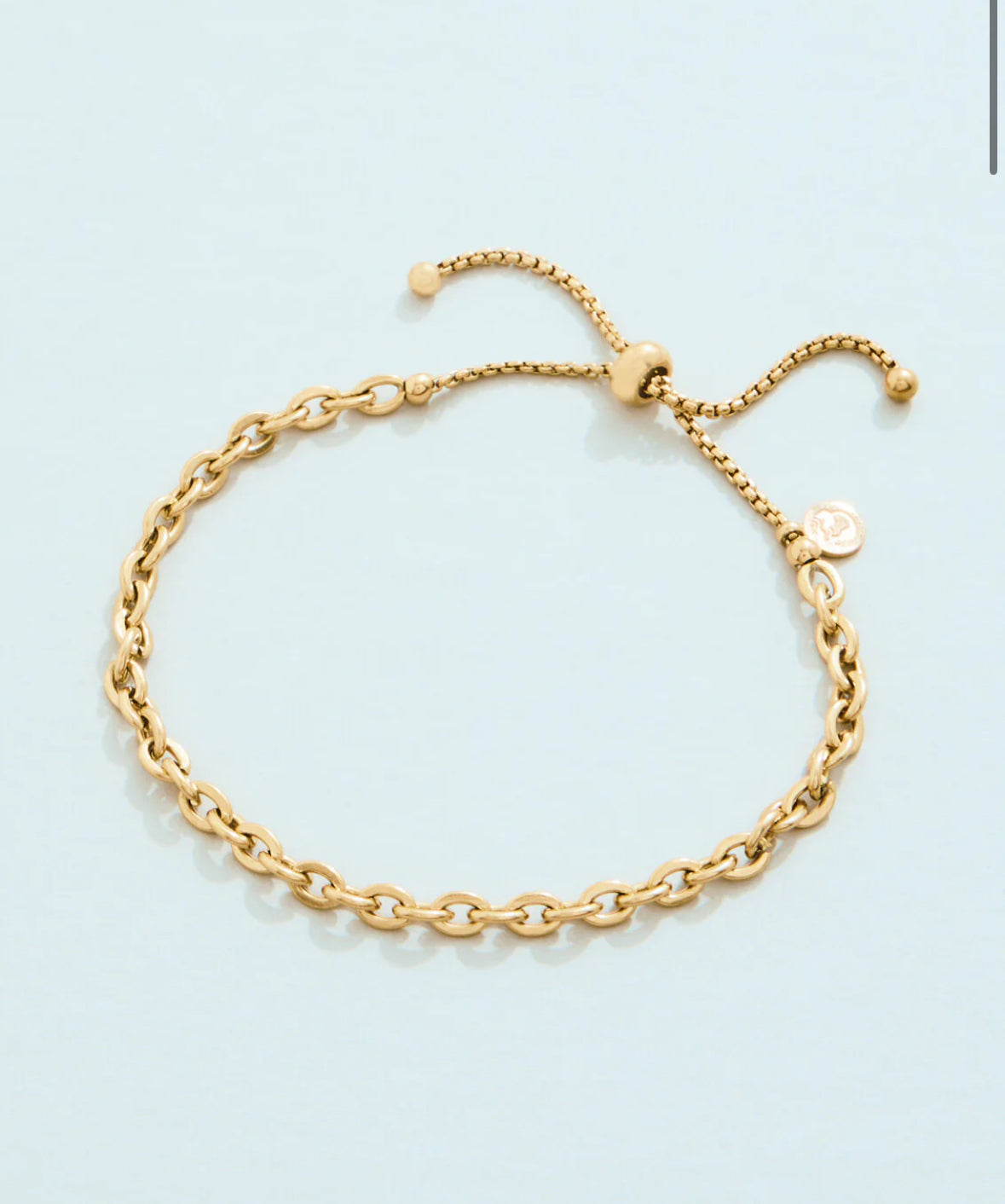 Our Anchored Slide Bracelet features a sleek chain and adjustable slider for effortless, on-trend style and a perfect fit. Great for stacking or mixing and matching. You'll never want to take it off, and you don't have to! This tarnish free, water resistant jewelry is designed to shine through everyday wear, exercise, showers, and a summer at the beach.