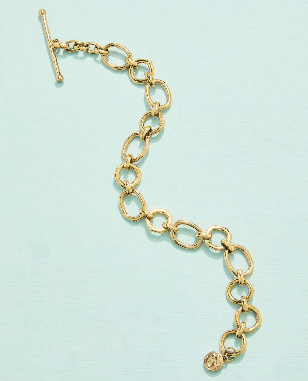 Make a splash with our Calhoun Toggle Bracelet featuring textured links and a custom toggle closure. Designed to shine through everyday wear, exercise, showers and a summer at the beach in tarnish free 14kt gold vacuum plating. This is a bracelet made for endless summers.