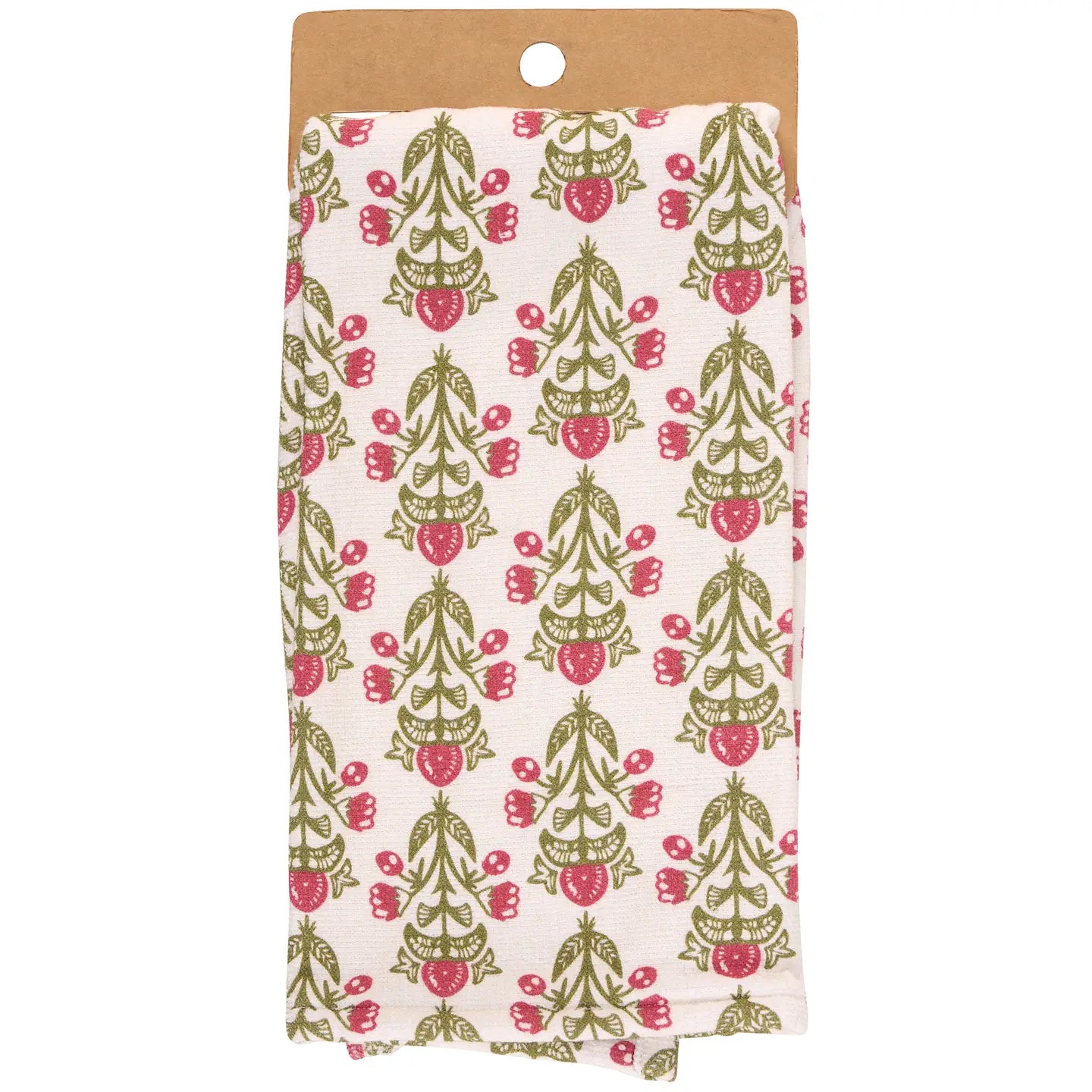 A cotton kitchen towel from our Christmas Collection displaying an all-over design of a floral block pattern that coordinates well with cabin decor. Christmas kitchen towel features a terrycloth layer on the back for added absorbency. Our Floral Block kitchen towel is conveniently machine-washable for easy cleaning. Seasonal kitchen towel is packaged on a cardboard hanger with hole to easily display on rack. A rustic Christmas kitchen accessory perfect for seasonal use.