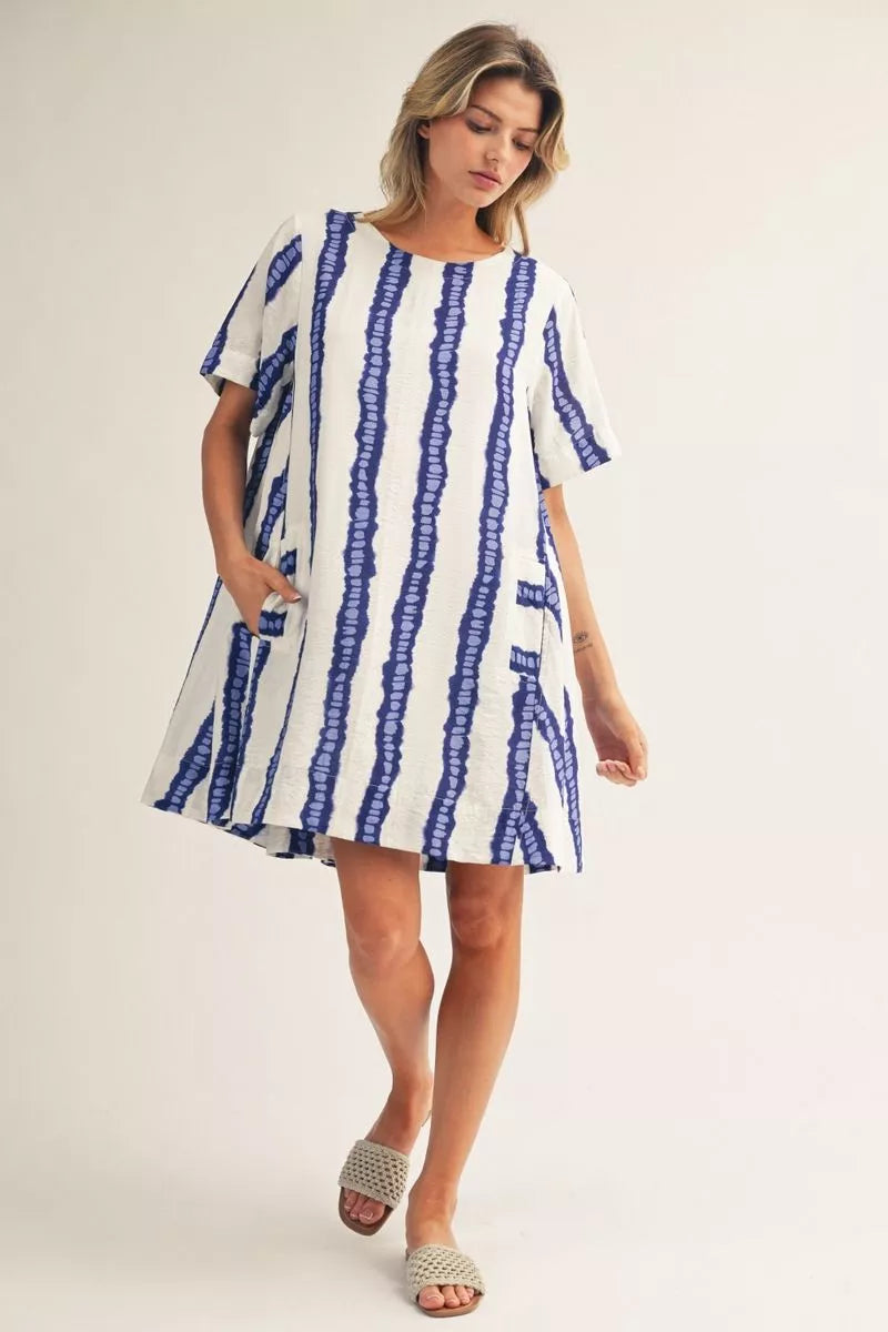 Short sleeves vertical tie dye print casual dress with pockets, button closure back, pleat back detail.