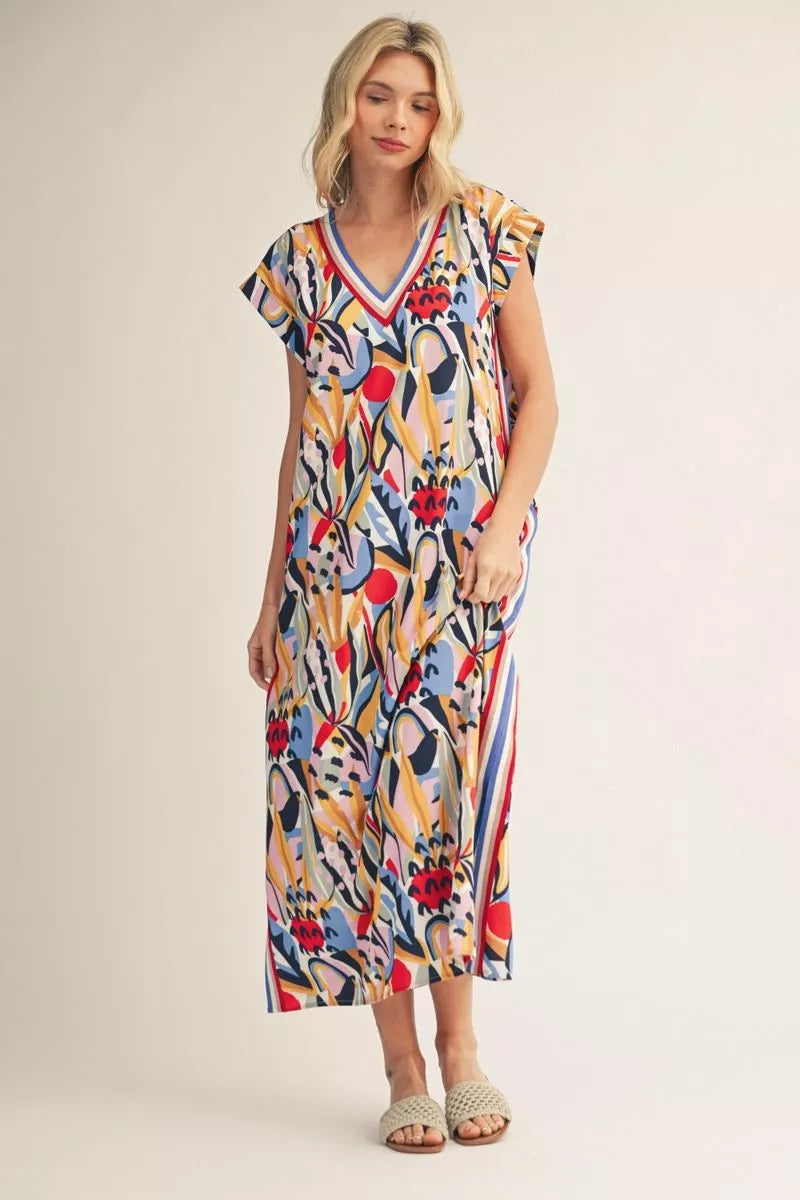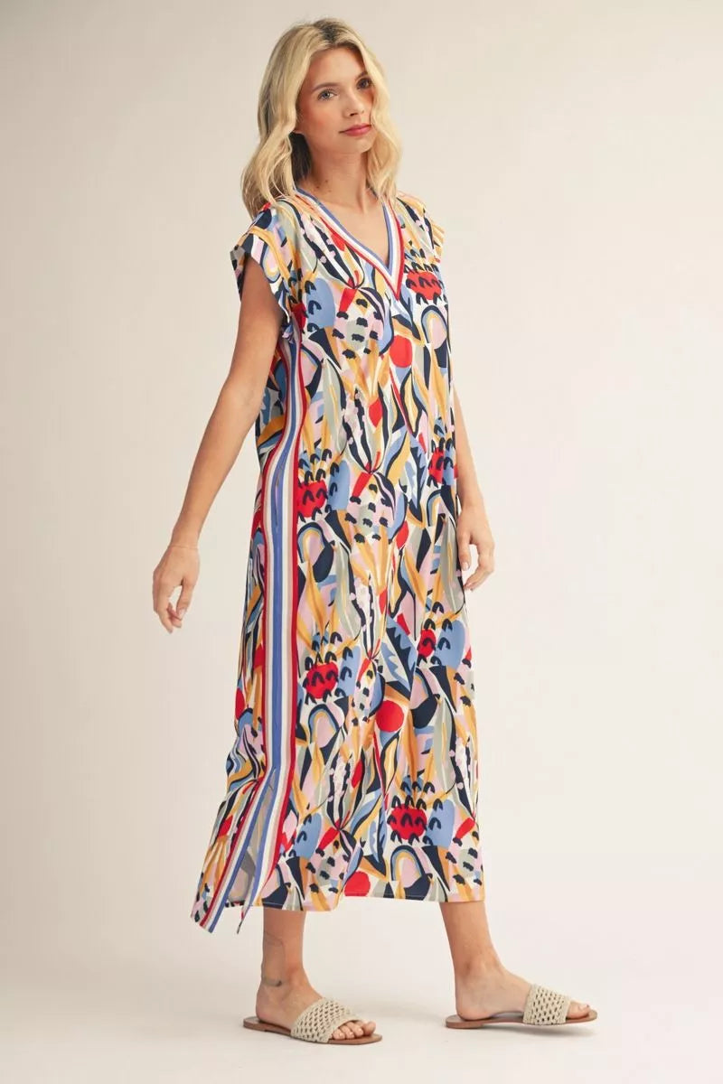Drop shoulder multi color geo print midi dress with side slit, side pockets, color band trim detail.