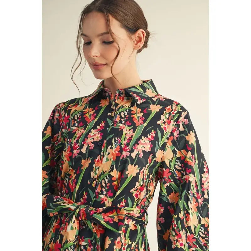 • Waist Tie Button Down Floral Dress