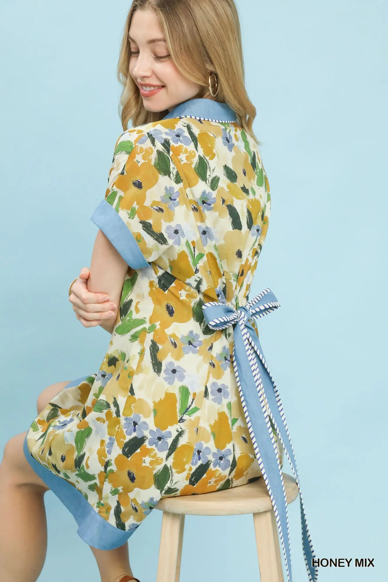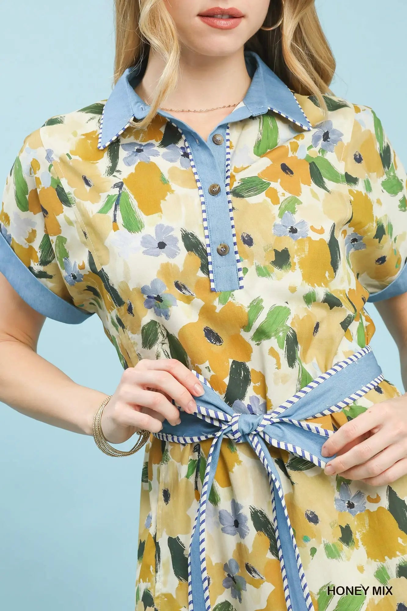 Honey Mix Watercolor Floral Belted Shirt Dress
