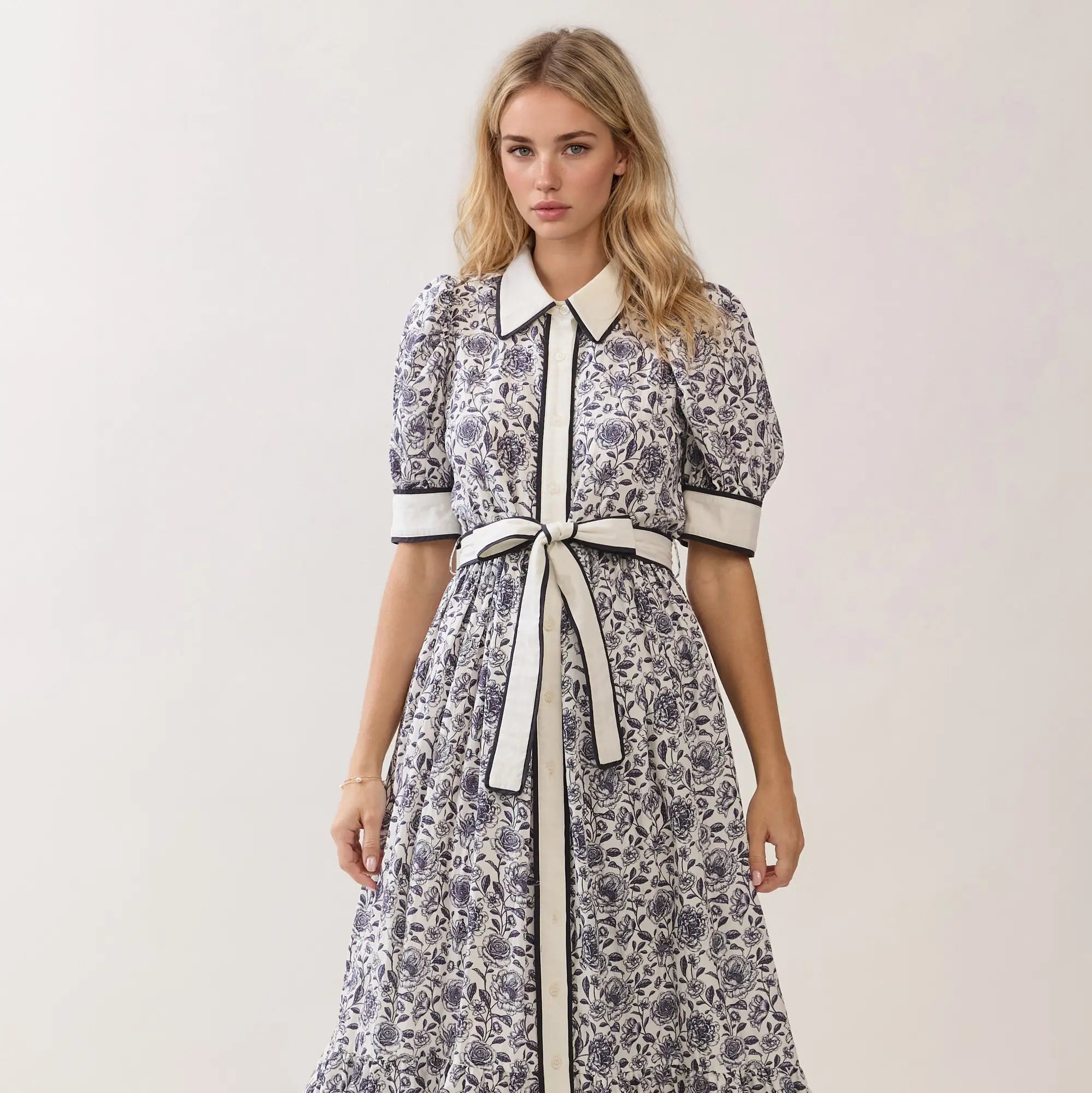 A floral-print midi dress featuring a classic pointed collar and short puff sleeves with contrast cuffs. Designed with a full button-down front and a removable self-tie belt to define the waist. Finished with contrast trim detailing and a softly flared skirt for an elegant A-line silhouette. Model Size + Fit: Model height: 5'11" Dress size: Small Bust: 31.5 Waist: 23.5 Hips: 35