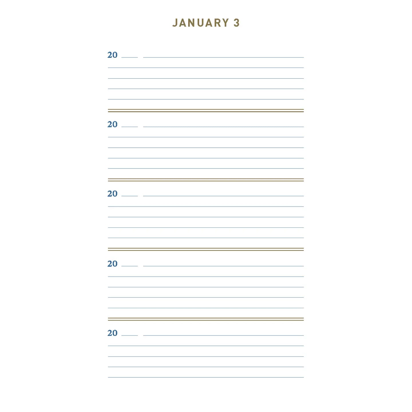 This keepsake memory book invites you to capture just a single quick line once a day over five years. As you write, the layout allows you to see your highlights and reflections on the same date in previous years. Uniquely rewarding, simple to complete, and presented in an exquisitely handsome package, this denim journal will become a treasure trove of memories to cherish forever.