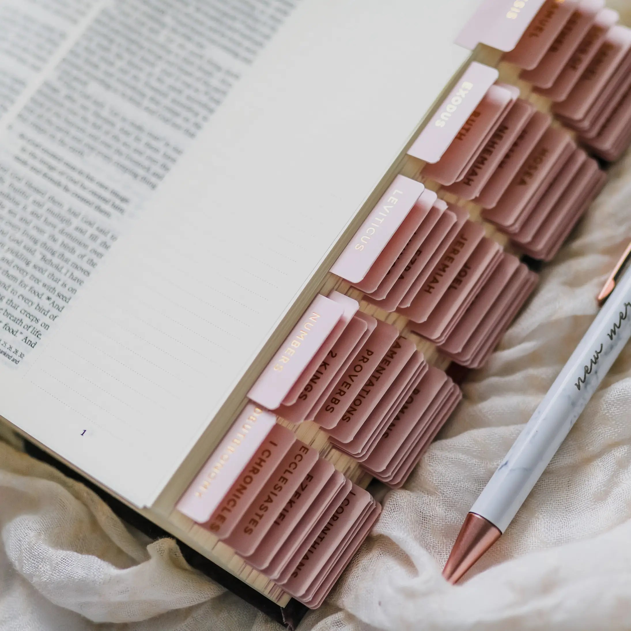 Flexible, matte coated sticker Bible tabs. Each set includes one double-sided tab for each book of the Bible as well as 23 additional sticker tabs.