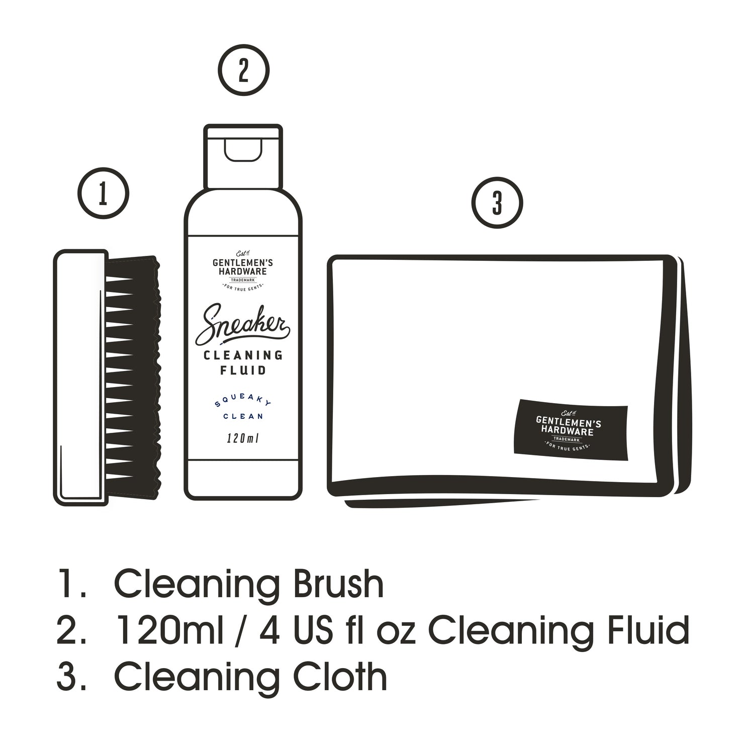 Sneaker Cleaning Kit includes 4 fl oz Cleaning Fluid, Cleaning Brush & Cloth. Packaged in giftable tin.