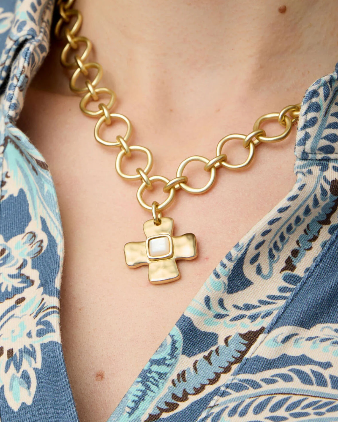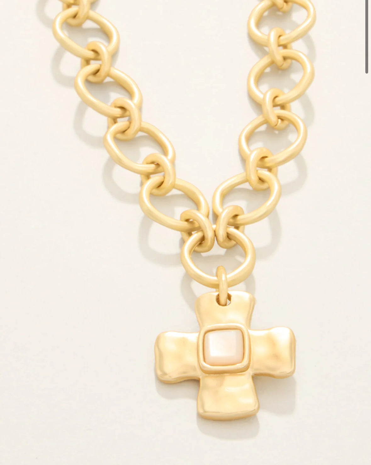 Our Affirmation Necklace features a classic cross-shaped charm with a luminous mother-of-pearl inlay, suspended from a bold custom chain. Designed as a personal talisman, it serves as a daily reminder to set your intention and carry it with you.