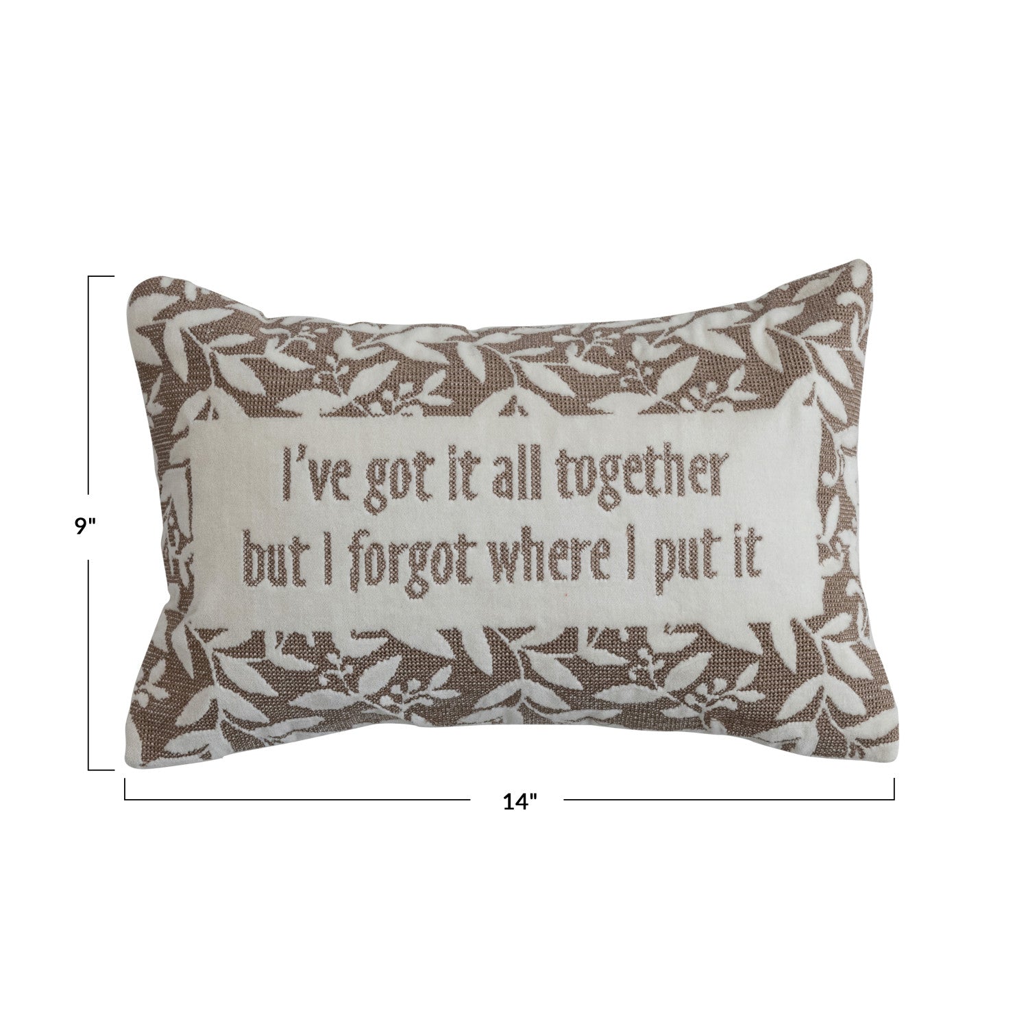 14"L x 9"H Cotton Velvet Embroidered Lumbar Pillow w/ Botanical Pattern "I've Got It All Together…", Beige & Natural