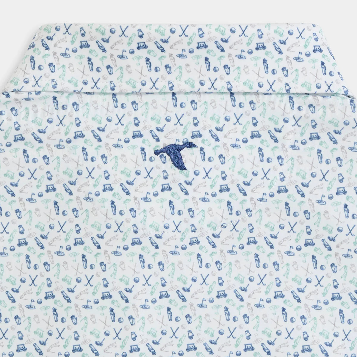 The Caddie’s Choice Printed Polo features golf essentials, from gloves and pins to clubs, bags, and a golfer silhouette.
