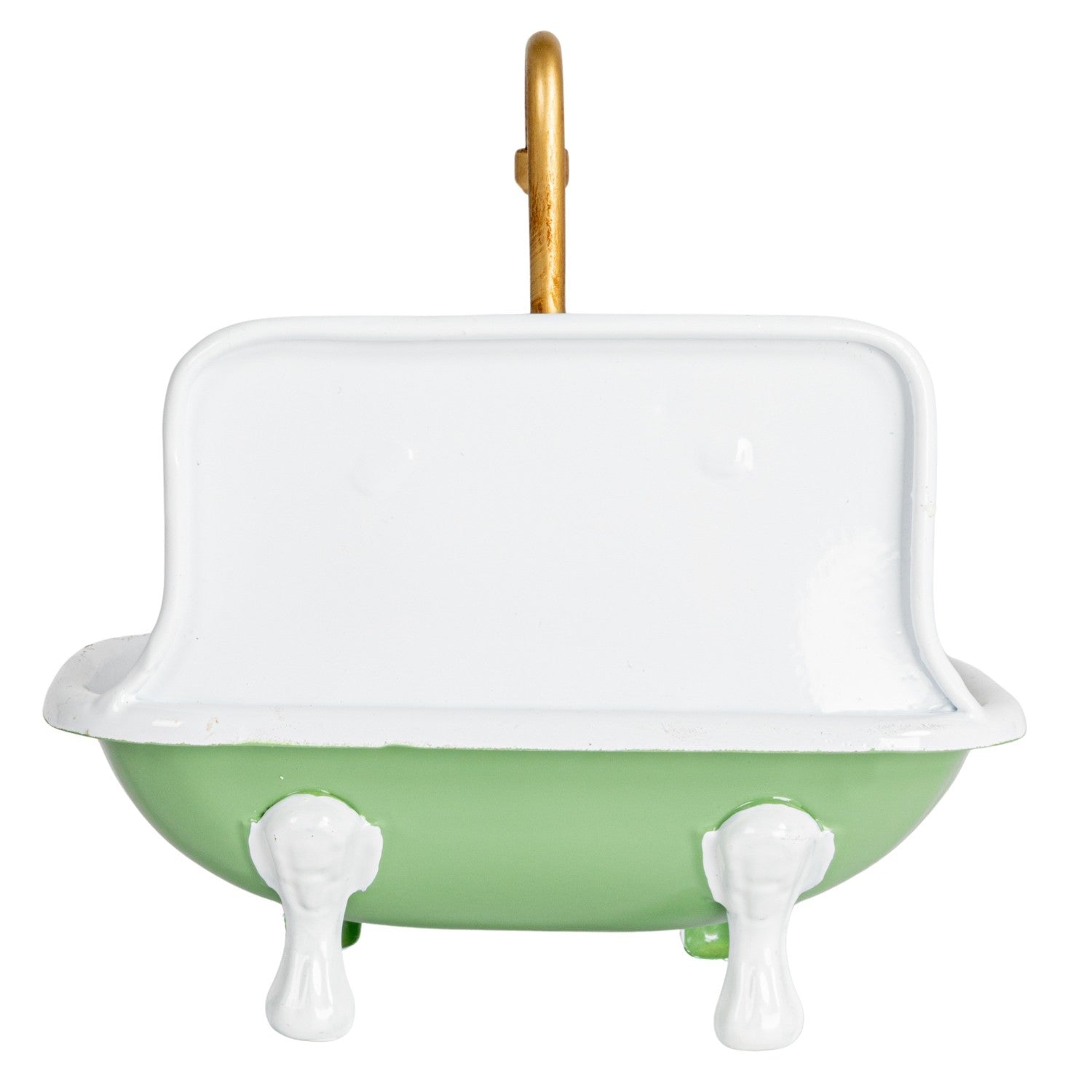This Metal Soap Dish, designed to resemble a vintage sink with a faucet, brings a unique and playful element to the bathroom decor. Its green, white, and gold finish adds a splash of color and a hint of nostalgia to the space. The dish's square shape and size, measuring 5.75 inches both in length and height, make it an ideal fit for any countertop. Whether the home features industrial, farmhouse, or rustic aesthetics, this soap dish serves as a functional piece of art that captures the essence of a bygone era. Each one is distinct, ensuring that the soap dish is as individual as any style.
