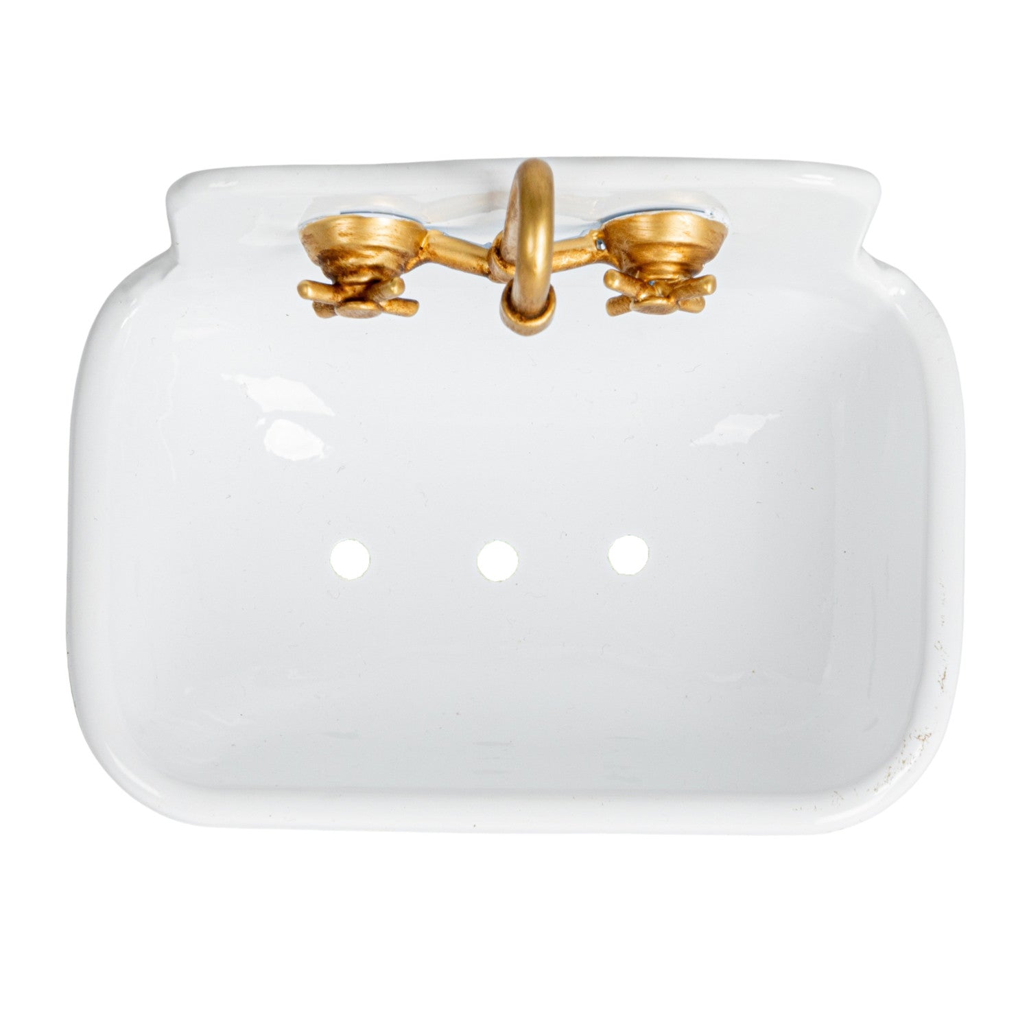 5-3/4"L x 4"W x 5-3/4"H Metal Sink Soap Dish w/ Faucet, Green, White & Gold Finish
