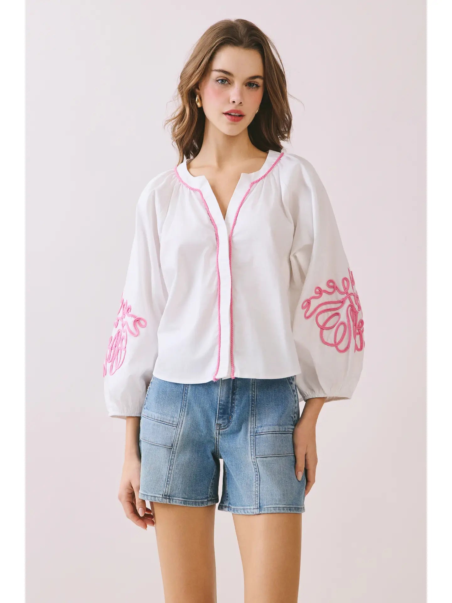 A voluminous 3/4 puff sleeves blouse with a bold embroidery. Designed with a split neckline and contrast trim along the placket and collar. Model Size + Fit: Model height: 5'11" Dress size: Small Bust: 31.5 Waist: 23.5 Hips: 35