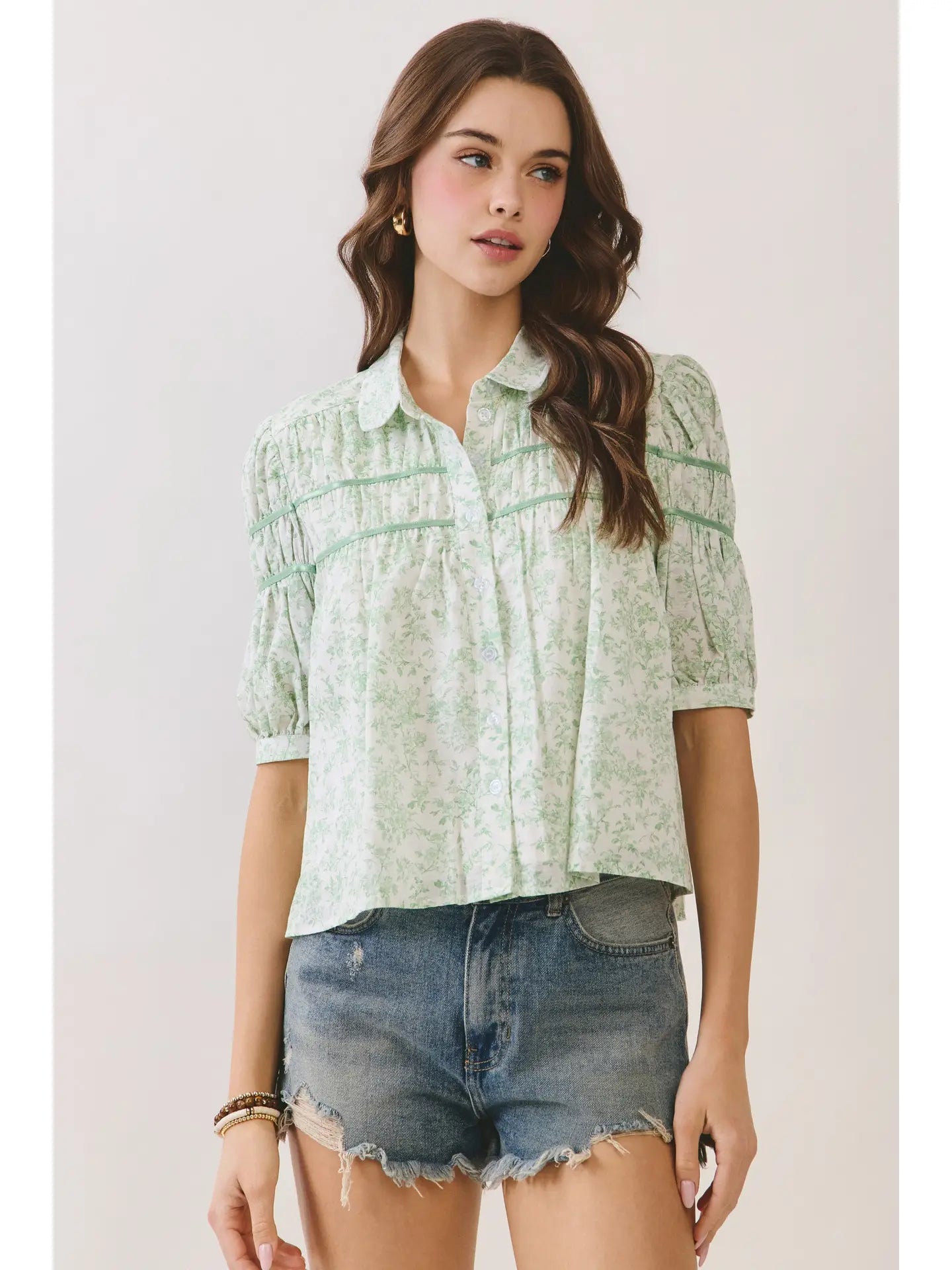 A floral print blouse featuring a classic collar and button down front. Designed with short puff sleeves and delicate pintuck detailing for added texture. Model Size + Fit: Model height: 5'11" Dress size: Small Bust: 31.5 Waist: 23.5 Hips: 35
