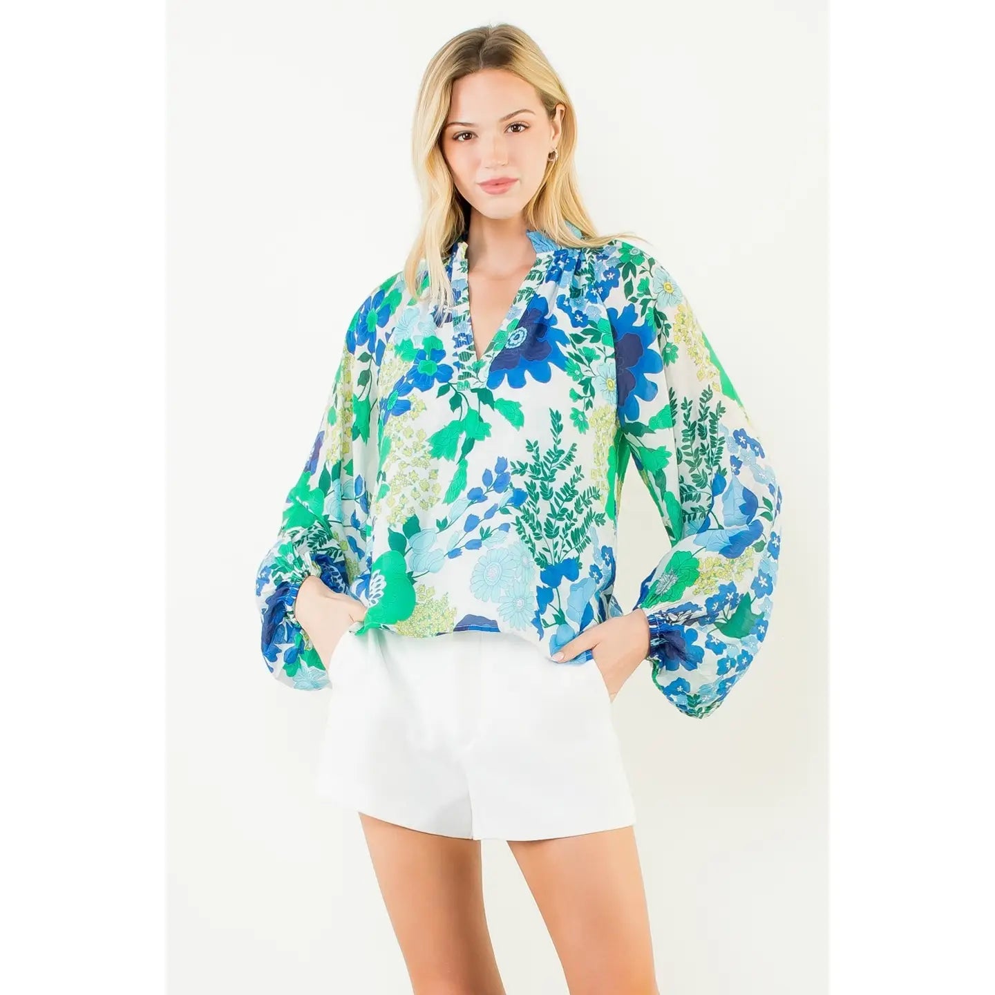Floral Print Long Sleeve Top . / Style Measurements for Size S / Designed in USA - Body Length: 23 1/2 in - Bust Width: 40 1/2 in - Sleeve Length: 20 1/2 in . / Model Sizes - Wearing Size S - Height 5' 9", Bust 32", Waist 25 1/2", Hips 36" . / per Color Only . / Fabric Content - WOVEN / 71% Rayon, 29% Nylon