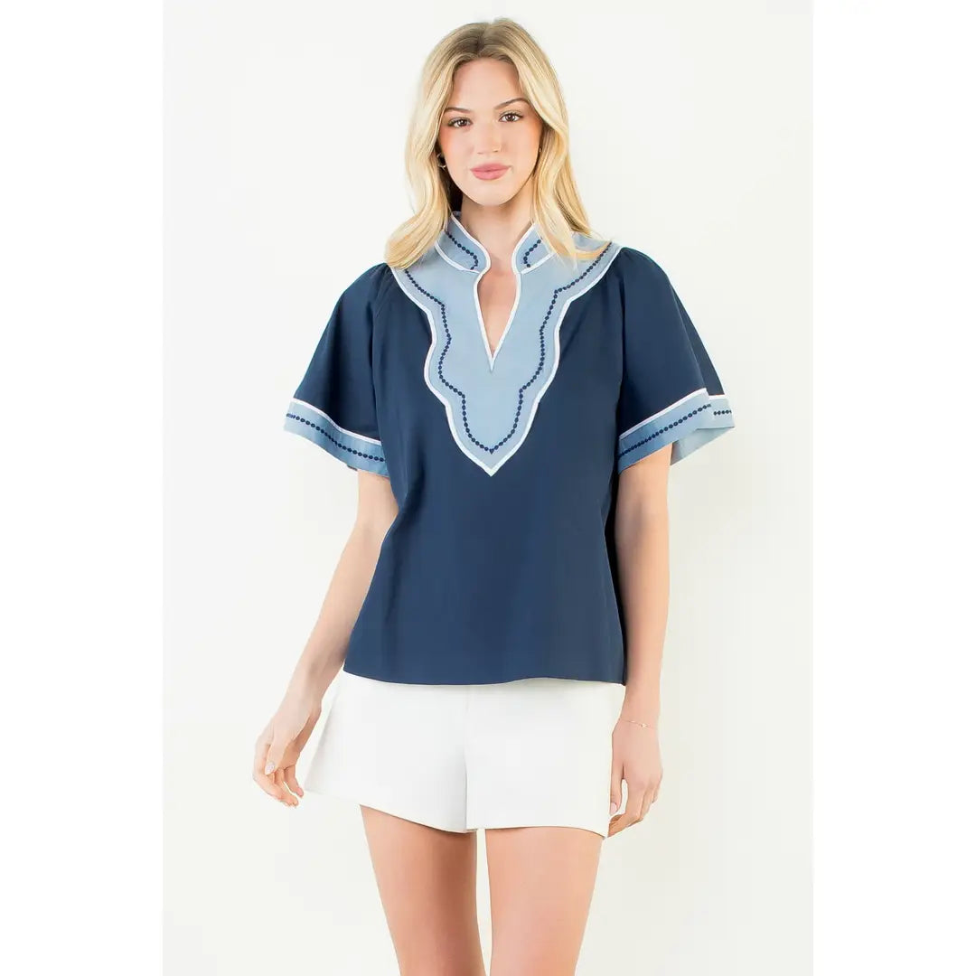 Wide Sleeve Contrast Trim V-Neck Top Navy