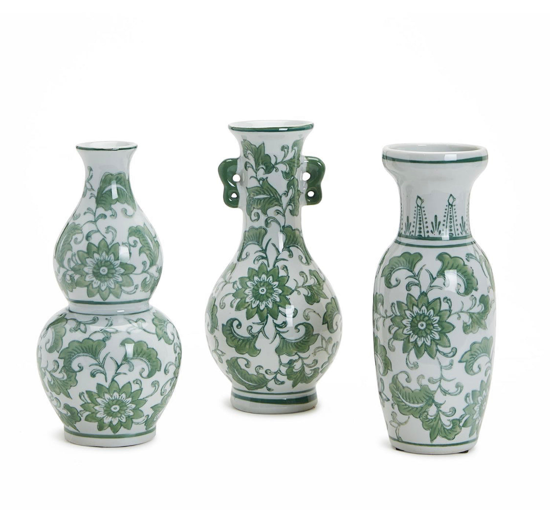 Traditional Chinese shapes never looked so wonderful in countryside green. Arrange them alone or in a set on a bookshelf or fill them with a dramatic arrangement of flowers on a hallway table.