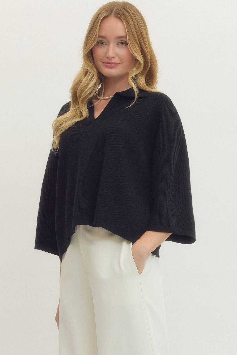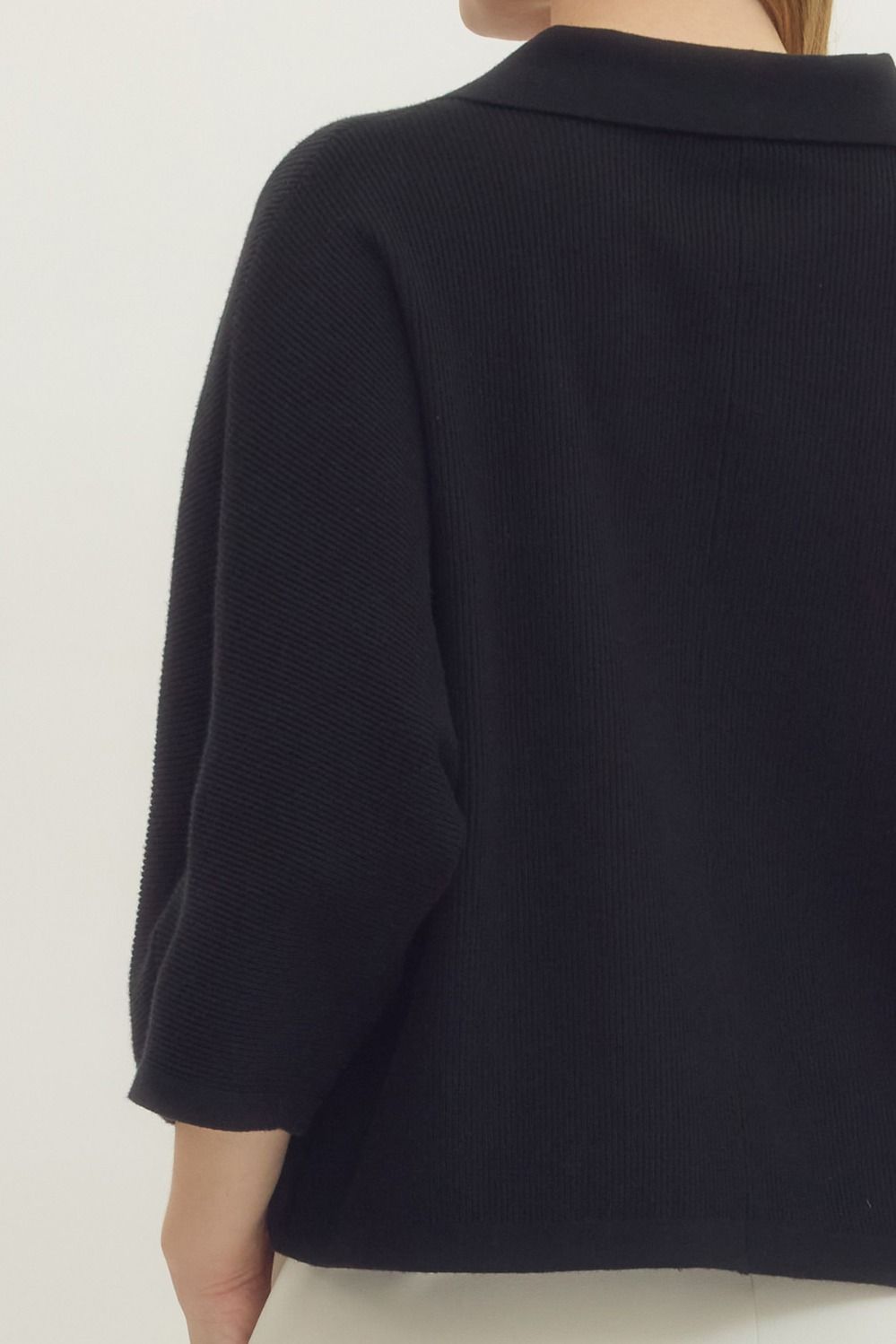 Solid 3/4 sleeve knit top featuring open V-neck collar. Unlined. Knit. Non-sheer. Medium weight.