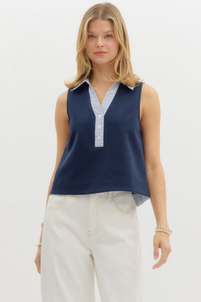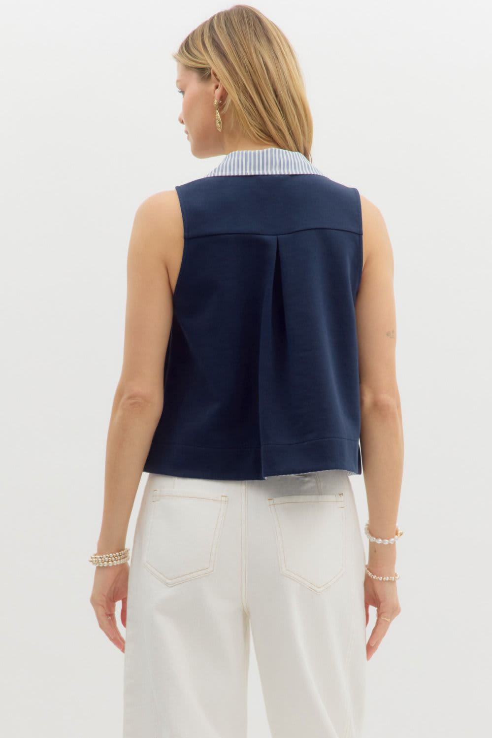 Solid jersey knit sleeveless mid-length pullover top featuring contrast accented spread collar button front closure. Unlined. Knit. Non-sheer. Lightweight.