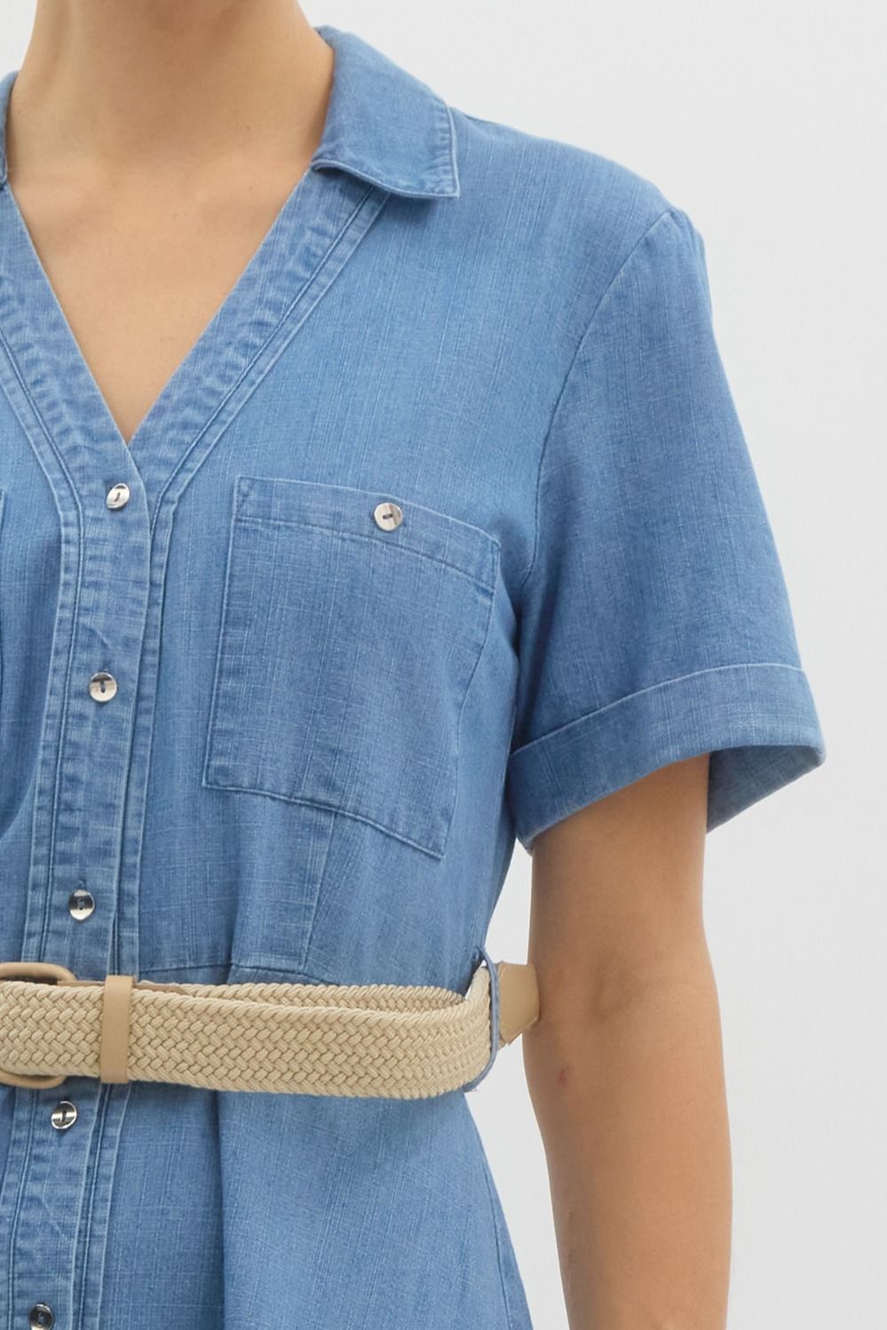 - Denim short cuffed sleeve midi dress featuring braided belt at waist