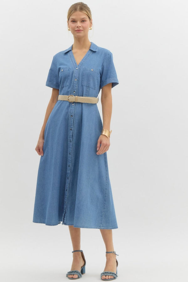 Get ready to conquer your day with this Denim Midi Shirt Dress with Belt . This adorable collared button down denim midi dress can be styled with or without the included waist belt, making it perfect for any occasion. Whether you're on the go or taking it easy, this dress will have you feeling easy breezy.