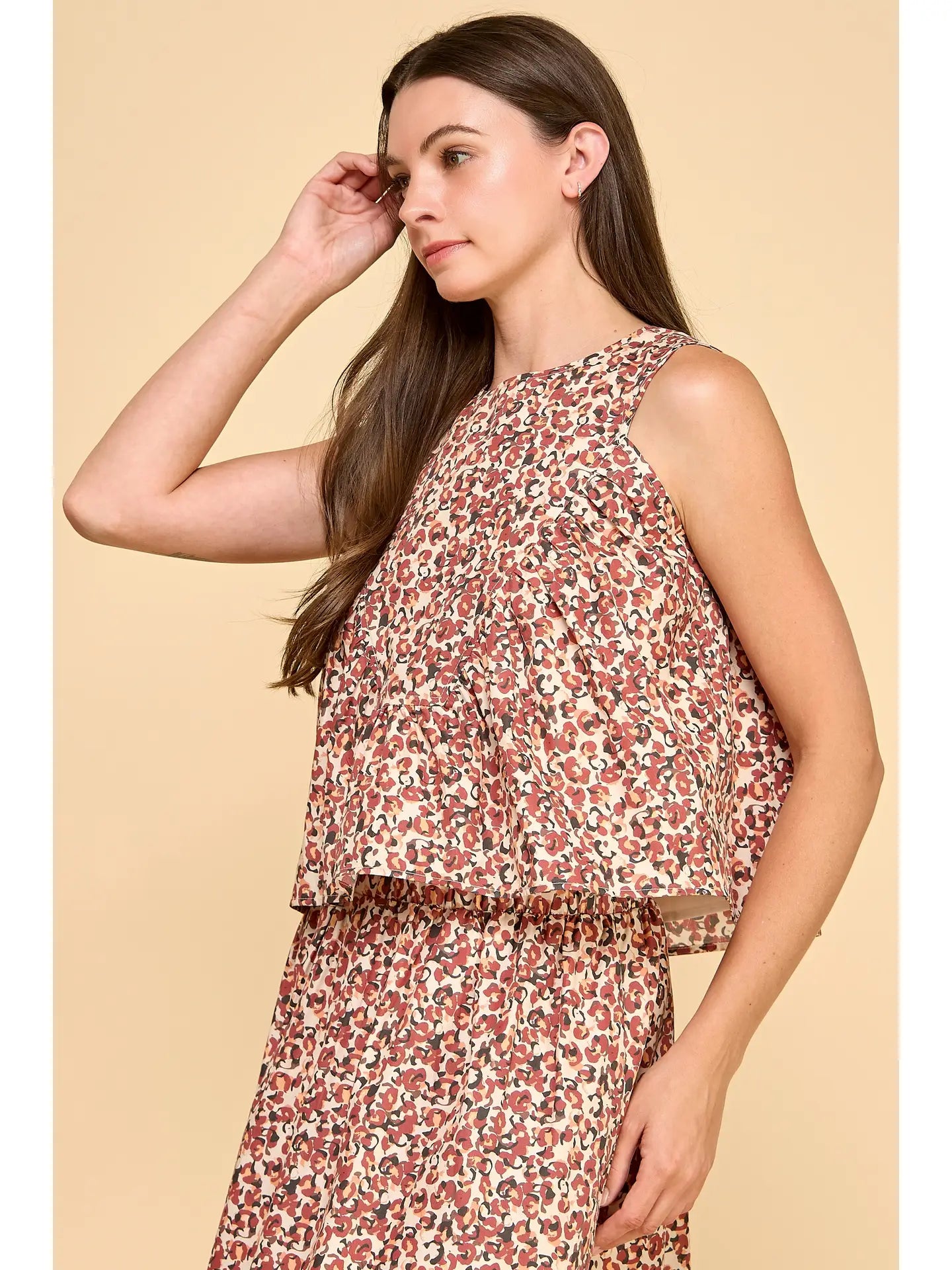 Abstract floral print sleeveless tiered top featuring a round neckline, pleated front, and a flowy silhouette. Keyhole closure at back. Pair with CS3898. Model Size + Fit: Model height: 5'11" Dress size: Small Bust: 31.5 Waist: 23.5 Hips: 35