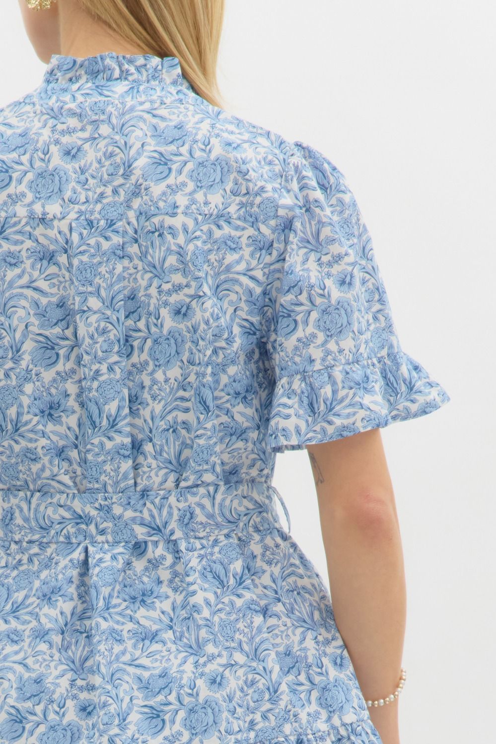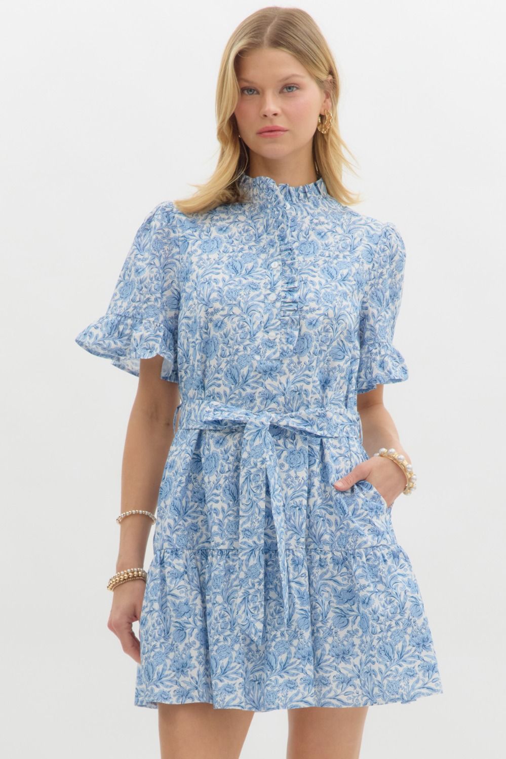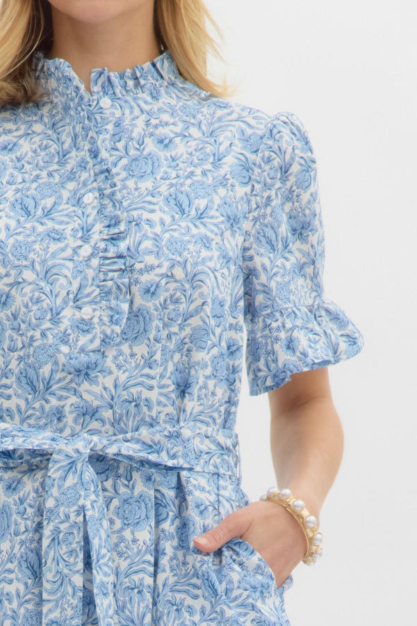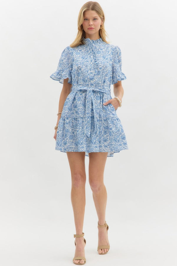 Floral print ruffle accent short sleeve pullover mini dress featuring ruffle accent band collar half button closure. Removable self belf. Pockets at side. Lined. Woven. Non-sheer. Lightweight.