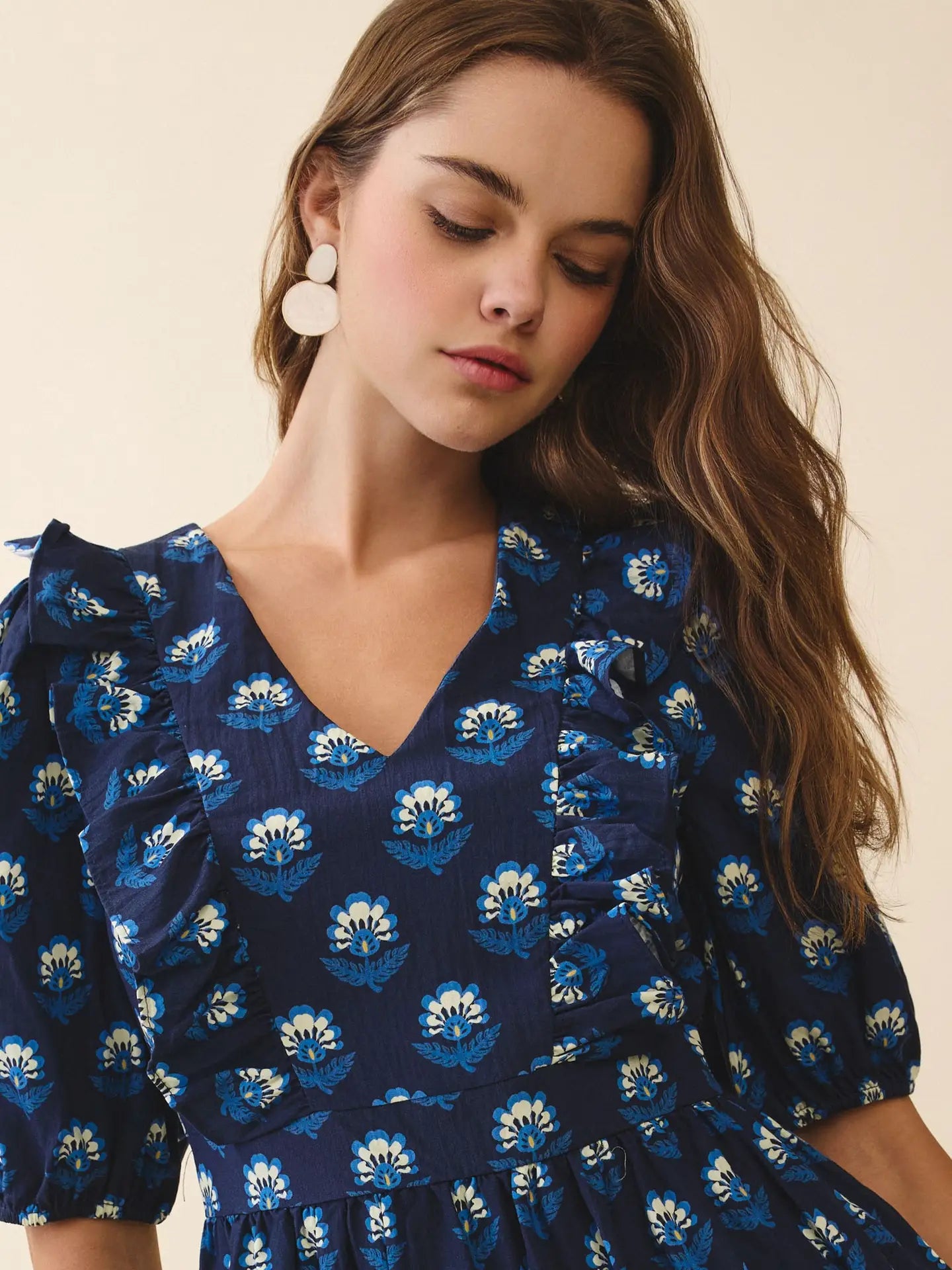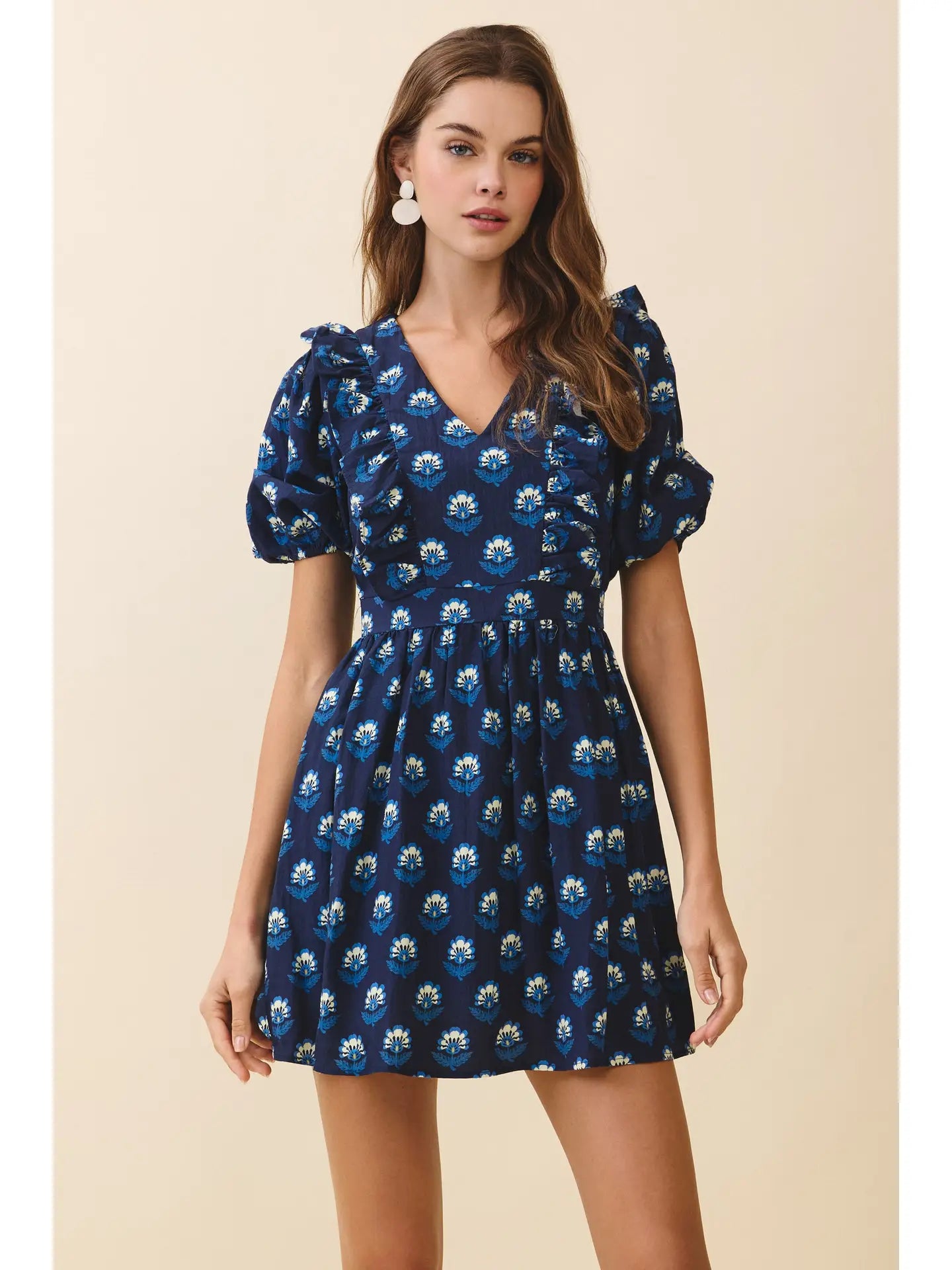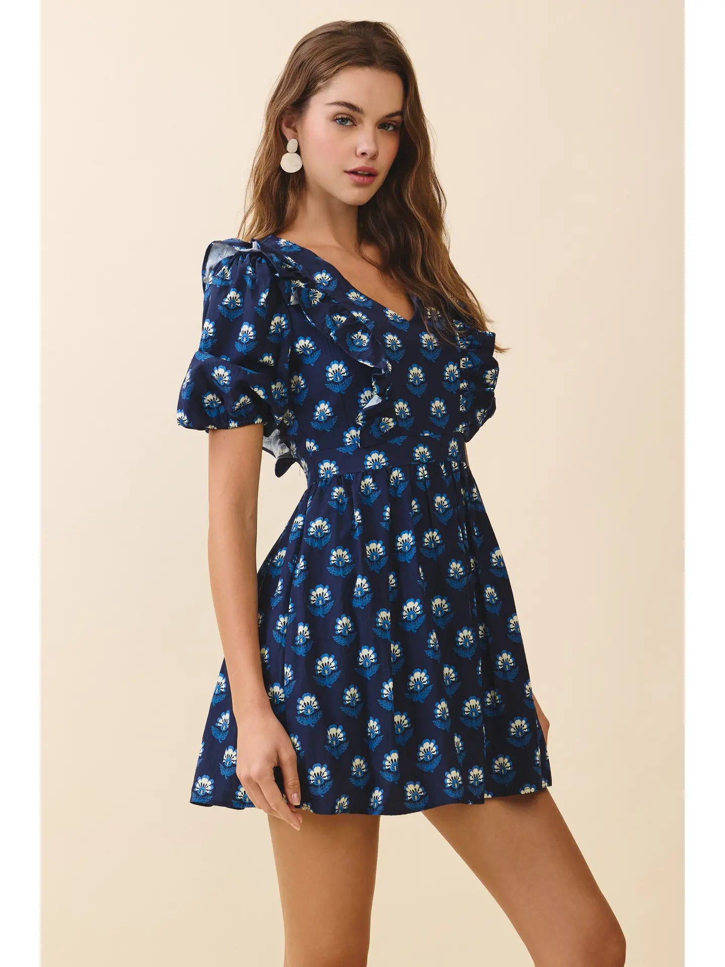 A floral mini dress featuring a V-neckline and short puff sleeves. Designed with cascading ruffle trims along the front and shoulders, it cinches at the waist before falling into a softly flared skirt. Back concealed zipper closure. Model Size + Fit: Model height: 5'11" Dress size: Small Bust: 31.5 Waist: 23.5 Hips: 35
