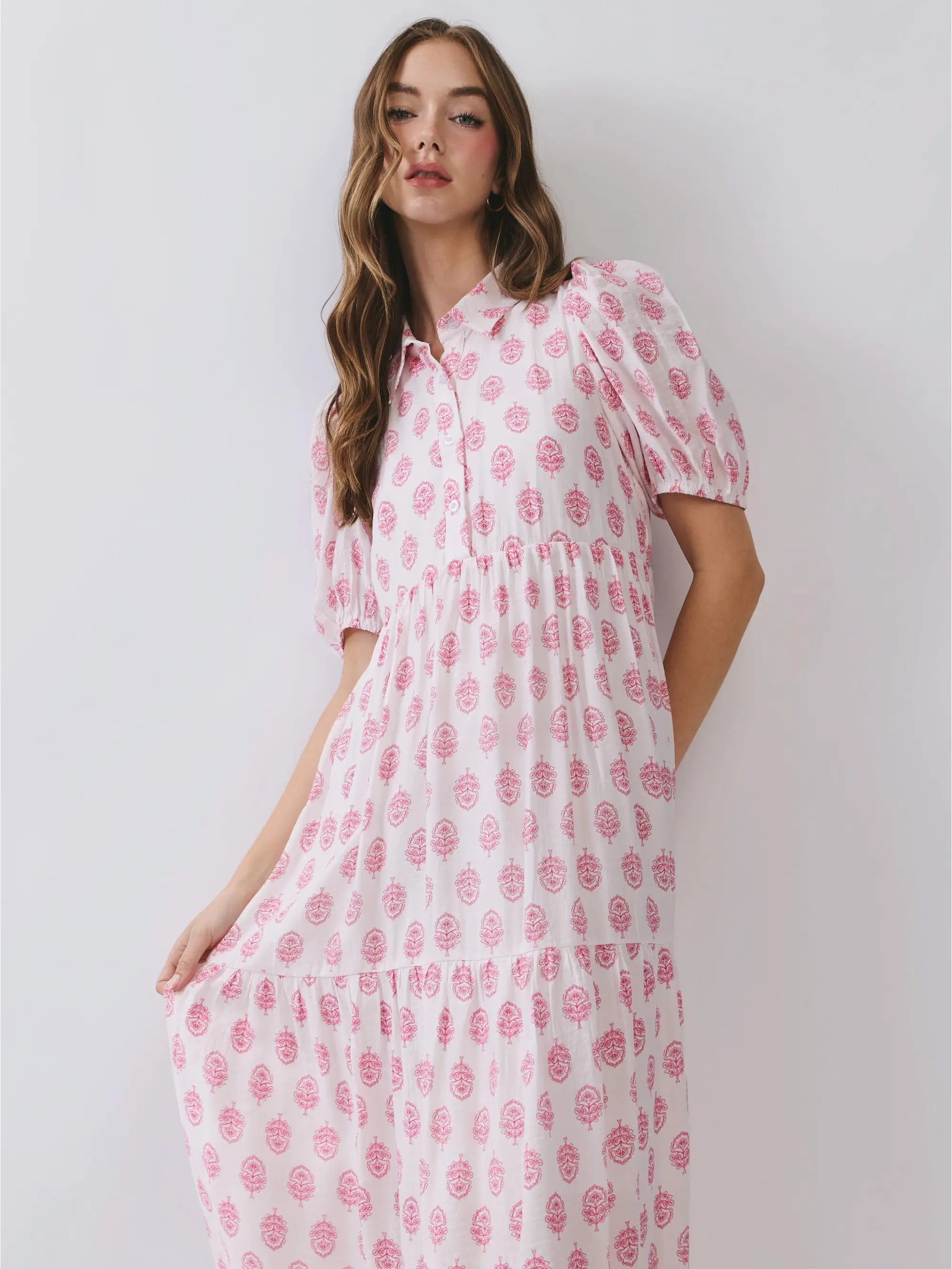 A charming midi dress featuring an allover floral print with a collared neckline and front button down closure. Designed with short puff sleeves and a softly gathered waist that flows into a tiered skirt for a relaxed. Model Size + Fit: Model height: 5'8" Dress size: Small Bust: 32 Waist: 24.5 Hips: 35.5