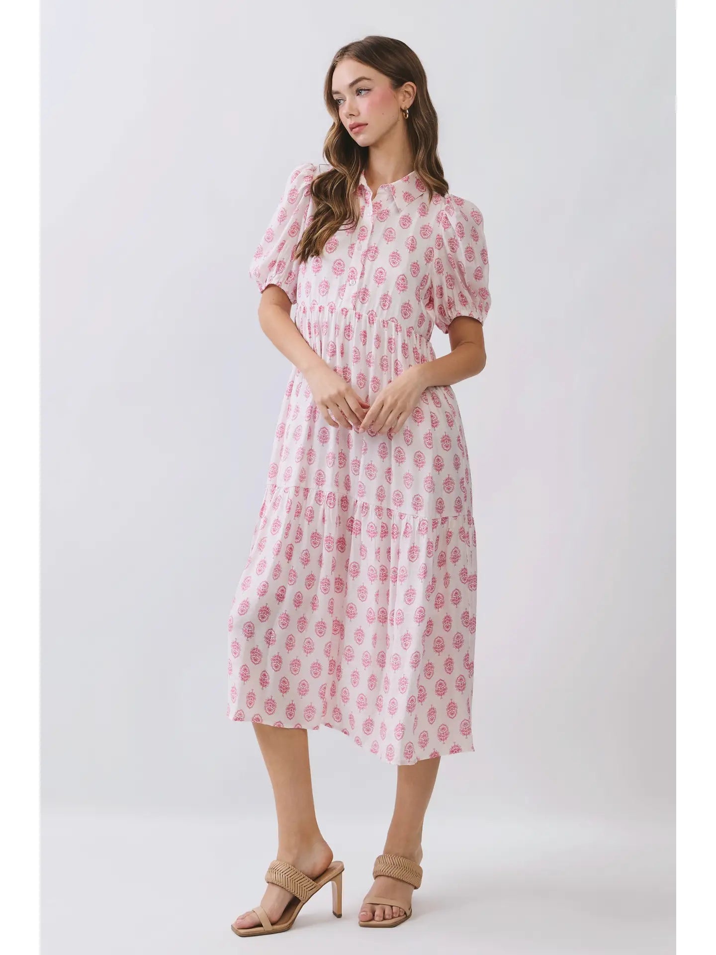 Pink Floral Print Puff Sleeve Tiered Midi Dress