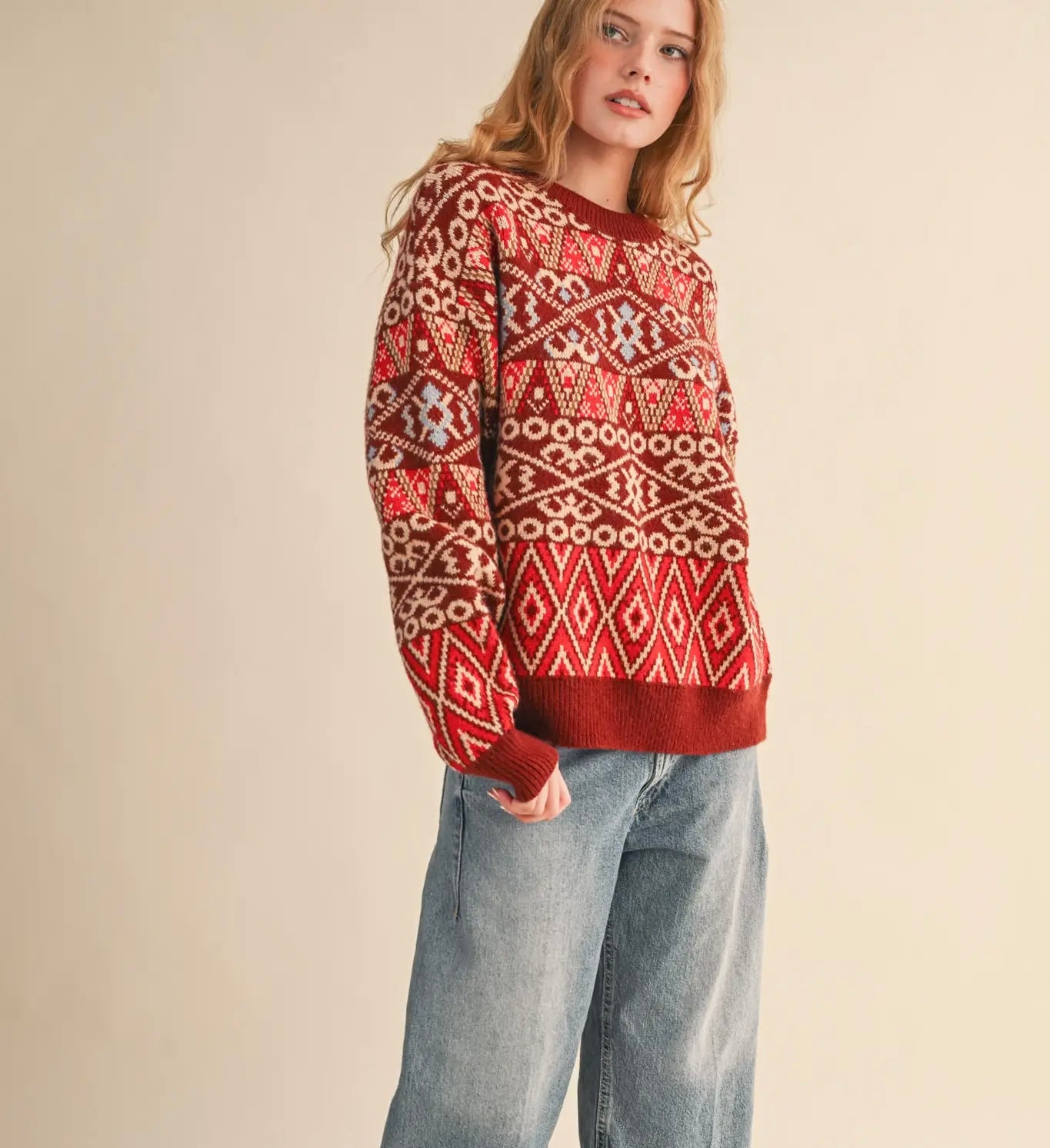 Snuggle up for the chilly season with this colorful fair isle knit sweater! Cozy sweater knit, with a colorful fair isle knit pattern throughout, shapes this casual sweater that has a ribbed round neckline framed by drop shoulder long sleeves that end in ribbed cuffs. Pair this versatile sweater with your favorite bottoms to upgrade any look!