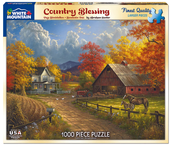 Storm clouds gather over an otherwise bucolic farm scene, painted by artist Abraham Hunter. Lights glow in the farmhouse and chickens peck away in the yard next to the farmer's tractor. Nearby, a mare and foal wait to be led to the safety and comfort of the barn, to keep company with the cow and calf already in residence. 1,000 piece puzzle. Finished size 24" x 30".