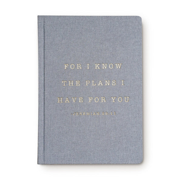 Write down all of your goals and dreams in our hand lettered for i know the plans i have for you jeremiah 29:11, cool grey and gold fabric journal! With this chic, stylish, easy to write on notebook, there's no better place to jot down motivational notes, inspirational quotes, lists, and all of your great ideas.