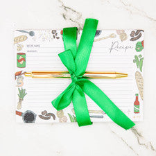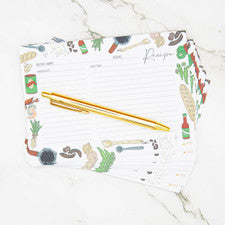 Combine tradition and modern style with this recipe card set. Write down family recipes (or recipes from your favorite food blog) on the festive cards! The set includes 40 recipe cards that are decorated with hand-drawn illustrations of your favorite Southern food staples -- French bread, green onions, shrimp, and more -- along with a gold pen. Each card has dedicated space for the recipe name, servings, ingredients, and directions. The cards are made of high-quality, 65 gsm, uncoated cardstock.