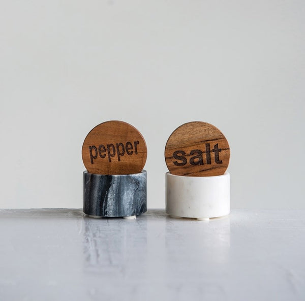 2-1/2" Round Marble Salt & Pepper Pot w/ Wood Lid, Black & White, 2 Styles