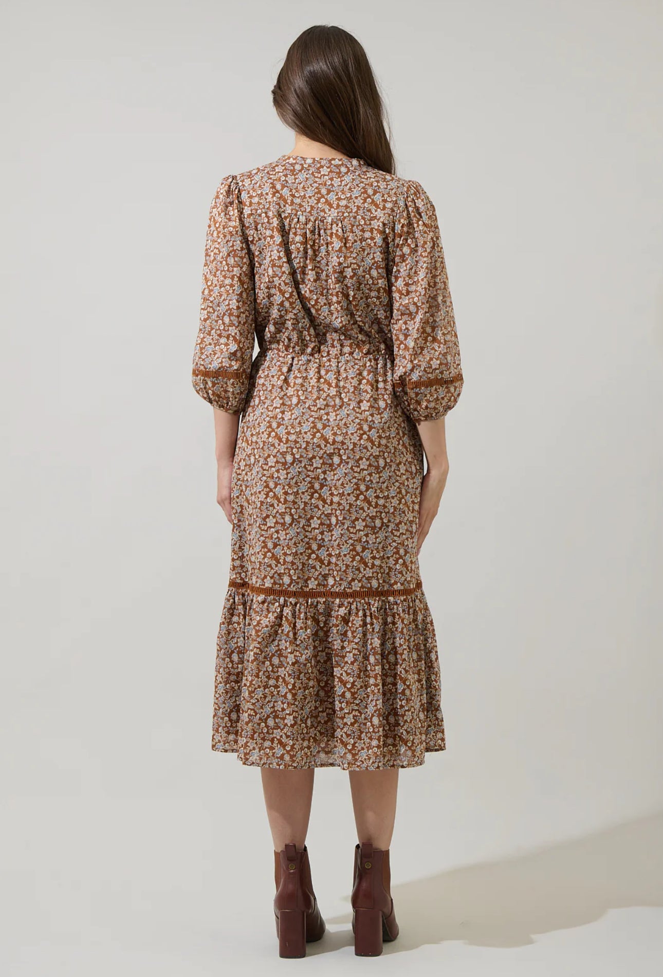 Fall in love with the charm of this floral midi dress. The flowy tiered skirt and puffed sleeves add a touch of romance. A sweet tie waist flatters your shape, and the soft notch neckline makes it effortlessly feminine. Perfect for garden strolls, weekend brunch, or simply twirling the day away.