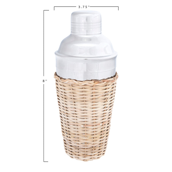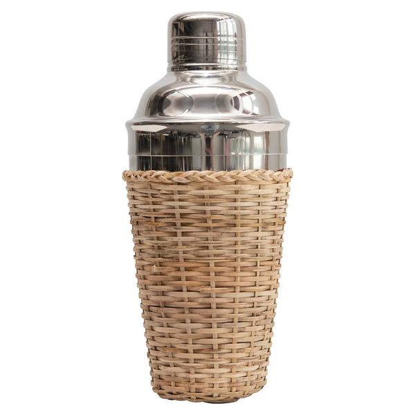 Beautiful stainless steel cocktail shaker is decorated in a woven rattan sleeve. It is ideal for the tropical decor. Pair with drinking glasses decorated with woven seagrass covers or a woven rattan basket. Display on a bar cart with other woven accent pieces.