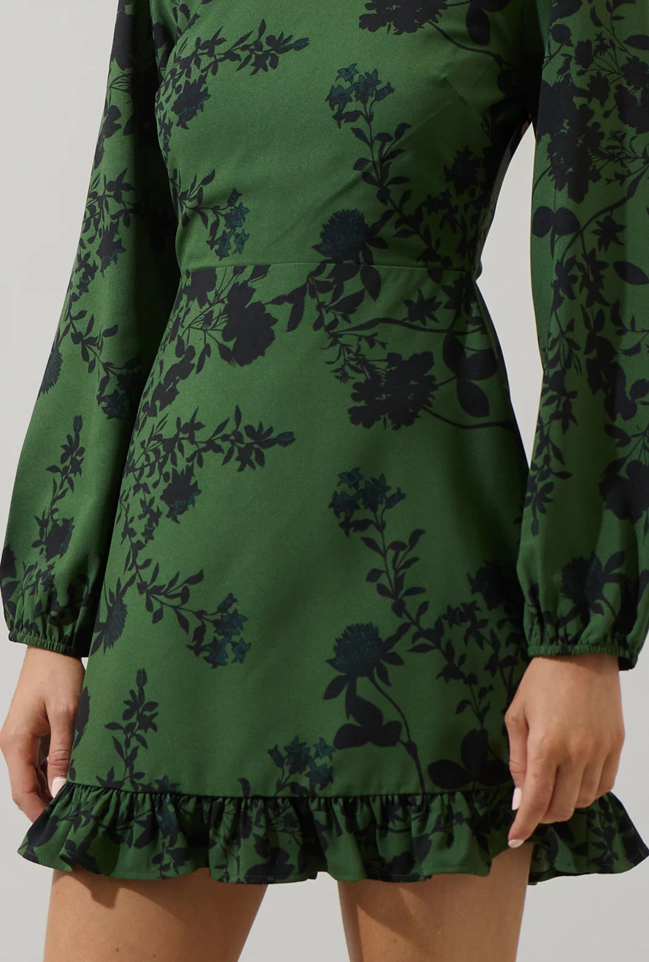 Make a statement this season with a dress that exudes effortless fall and winter charm. This mini dress in olive and black features a floral pattern, long sleeves, a round neck, an invisible back zipper, and a back tie that creates a dramatic keyhole opening. Pair it with ankle boots, a leather crossbody bag, and gold hoop earrings for a chic and cozy seasonal look.